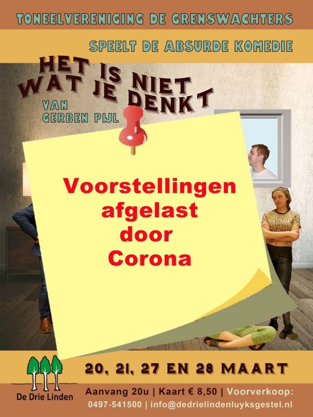 Ondanks alle voorbereidingen en inspanningen van onze spelers hebben wij besloten de voorstellingen “Het is niet wat je denkt” op 20, 21, 27 en 28 maart niet door te laten gaan.